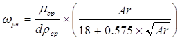 ρср = [29∙(105–9687,5)+18∙9687,5]∙273/(22,4∙105∙(273+190)) = 0,735 кг/м3; Ar = (d3∙ρч∙ρср∙g) / µср2 = [(1∙10-3)3 ∙1200∙0,735∙9,8]/(0,025∙10-3)2 = 34,6∙104; μср и ρср – вязкость и плотность сушильного агента при средней температуре; d – диаметр частиц материала, м; ρr – плотность частиц материала. Скорость уноса равна: