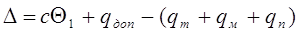где Δ – разность между удельными приходом и расходом тепла непосредственно в сушильной камере; с – теплоемкость влаги во влажном материале при температуре Θ1, кДж/(кг∙К); qдоп – удельный дополнительный подвод тепла в сушилку, [кДж/кг∙влаги]; при работе сушилки по нормальному сушильному варианту: qдоп = 0; qт – удельный расход тепла в сушилке с транспортными средствами, кДж/кг влаги; в рассматриваемом случае: qт = 0; qм – удельный расход тепла в сушильном барабане с высушиваемом материалом, кДж/кг∙влаги