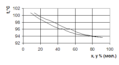 Рис. 2.1: Принципиальная схема ректификационной установки: 1 - теплообменник-подогреватель; 2,6 - насосы; 3 - емкость для исходной смеси; 4 - кипятильник; 5 - ректификационная колона; 7 - дефлегматор; 8 - холодильник дистиллята; 9 - холодильник кубовой жидкости; 10 - емкость для кубовой жидкости; 11 - емкость для сбора дистиллята Исходную смесь из промежуточной емкости 1 центробежным насосом 2 подают в теплообменник 3, где она подогревается до температуры кипения. Нагретая смесь поступает на разделение в ректификационную колонну 5, где состав жидкости равен составу исходной смеси xF. Стекая вниз по колонне, жидкость взаимодействует с поднимающимся вверх паром, образующимся при кипении кубовой жидкости в кипятильнике 4. Начальный состав пара примерно равен составу кубового остатка ХW, т. е. обеднен легколетучим компонентом. В результате массообмена с жидкостью пар обогащается легколетучим компонентом. Для более полного обогащения верхнюю часть колонны орошают в соответствии с заданным флегмовым числом жидкостью (флегмой) состава хР, получаемой в дефлегматоре 6 путем конденсации пара, выходящего из колонны. Часть конденсата выводится из дефлегматора в виде готового продукта разделения — дистиллята, который охлаждается в теплообменнике 7 и направляется в промежуточную емкость 8. Из кубовой части колонны насосом 9 непрерывно выводится кубовая жидкость — продукт, обогащенный труднолетучим компонентом, который охлаждается в теплообменнике 10 и направляется в емкость 11. Таким образом, в ректификационной колонне осуществляется непрерывный неравновесный процесс разделения исходной бинарной смеси на дистиллят (с высоким содержанием легколетучего компонента) и кубовый остаток (обогащенный труднолетучим компонентом). 3 Расчётная часть 3.1 Задание и исходные данныеНеобходимо рассчитать насадочную ректификационную колонну для разделения бинарной смеси диоксан – толуол. GD=1000 кг/ч, xF=45% (мол.), xD=90% (мол.), xW=2% (мол.). Давление в колонне составляет 600 мм рт. ст., смесь поступает при температуре кипения. Равновесные даны о паре и t-x,y диаграмма представлены ниже. Таблица 3.1. Данные о равновесном составе пара