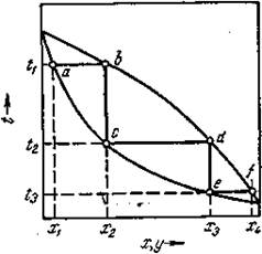 Рис 1.1 Изображение процесса разделения бинарной смеси путем ректификации на диаграмме t—х—у Процессы ректификации осуществляются периодически или непрерывно при различных давлениях: при атмосферном давлении, под вакуумом (для разделения смесей высококипящих веществ), а также под давлением больше атмосферного (для разделения смесей, являющихся газообразными при нормальных температурах). 2 Технологическая схема ректификационной установки Принципиальная схема ректификационной установки приведена на рисунке 2.1: