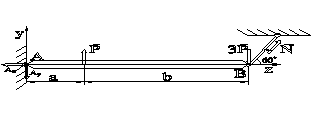 Определить: N - ?, Ay - ?, Az - ? Решение: 1.1 Уравнения равновесия балки: S(Py) = 0, S(Pz) = 0, S(mz) = 0 (1). Ay + P – 3P + N • sin 60° = 0 (2). Az + N • cos 60° = 0 уравнение моментов относительно точки A: (3). P • a – 3P • (a+b) + N • sin 60° • (a+b) = 0 Из уравнений (1), (2) находим: Ay = 2P – N • sin 60°, Az = – N • cos 60° Выражая силу N из уравнения моментов (3), получим: