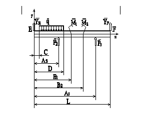 Знаки величин принимаются относительно направлений, обозначенных на рисунке. 1.1 Найти: YE-? ZE-? YF-? ZF-? Решение: Заменим опоры в точках E и F их реакциями. Таким образом несвободное тело EF становится свободным, и к нему можно применить условия равновесия. Для поперечных сил положительным принято направление по оси y ; положительным моментом - момент, сжимающий верхние волокна балки. Для расчета реакций опор распределенную нагрузку q заменим равнодействующей R, приложенной в середине отрезка CD действия нагрузки q, в точке с координатой (C+D)/2. R = q•Dl; Dl = D – С. Условия равновесия тела EF : еQyn = 0 : сумма поперечных сил еQzn = 0 : сумма продольных сил еMn = 0 : сумма изгибающих моментов Силы P1, P2, R приложены перпендикулярно к оси z, поэтому их проекции на эту ось будут нулевыми по величине, еQzn = 0. Уравнение суммы поперечных сил : YE – q • (D – С) + P2 + P1 + YF = 0 Уравнение суммы изгибающих моментов относительно точки E : – (D – С) • q • (С +D) / 2 + P2 • A2 – M1 + M2 + P1 • A1 + YF • L = 0 Знаки в уравнениях определены исходя из направлений, обозначенных на эквивалентной схеме нагрузки балки (рис.3), поэтому в уравнениях используются модули нагрузочных величин (ЅP1Ѕ,ЅP2Ѕ,ЅRЅ,ЅM1Ѕ,ЅM2Ѕ) и обозначаются без векторной черты. Возможные отрицательные значения искомых величин YE и YF будут означать противоположное их направление выбранному на схеме. Из уравнения моментов вычисляем силу YF : YF = [(D – C) • q • (С +D) / 2 – P2 • A2 + M1 – M2 – P1 • A1] / L YF = [(1,2–0,2)•20•(1,2+0,2)/2–10,0•1,0+16–11–8,0•2,5] / 3,1 » –3,6 Из уравнения поперечных сил вычисляем силу YE : YE = q • (D – С) – P2 – P1 – YF YE » 20 • (1,2 – 0,2) – 10,0 – 8,0 – (–3,6) = 5,6 [кН]. Для проверки составим уравнение моментов относительно другой точки. Знаки в уравнении определены исходя из эквивалентной схемы балки (рис.4), где искомые реакции опор YE и YF имеют правильные направления. Уравнение суммы изгибающих моментов относительно точки F : –(D–С)•q• [(L–D)+(L–C)]/2+YE•L+P2•(L–A2)+P1•(L–A1)+M1–M2=0 Обращение левой части уравнения в нуль при подстановке данных и найденных величин подтверждает правильность значений найденных реакций опор YE и YF. –(1,2–0,2)•20•[(3,1–1,2)+(3,1–0,2)]/2+YE•3,1+10,0•(3,1–1,0)+ +8,0•(3,1–2,5)+16–11 = 0; –17,2+5,6•3,1 » 0. 1.2 Найдем зависимость внутренних усилий (поперечных сил Q и изгибающих моментов M) на протяжении балки от координаты z, начиная от точки E (z - расстояние до точки E). Бесконечно близко1) слева (со стороны точки E) к точкам приложения сил и моментов проведем сечения. Таким образом, на протяжении балки образуются 7 участков. Рассмотрим, начиная от точки E, изменение внутренних напряжений (Q и M) балки на каждом участке в зависимости от координаты z. zn - расстояния от точки E до точек приложения нагрузок, z0 = 0. Пусть Q(z) - функция зависимости внутренней поперечной силы (балки) от координаты z; 0 Ј z < z7.
