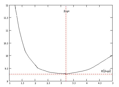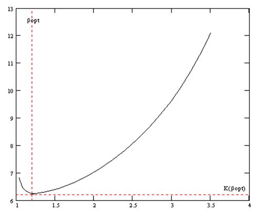 Рис.2 Зависимость критерия оптимальности от коэф-та избытка флегмы По графику определяем что Исходя из рабочего флегмового числа строим рабочую линию и определяем теоретическое число тарелок в верхней и нижней части секции.