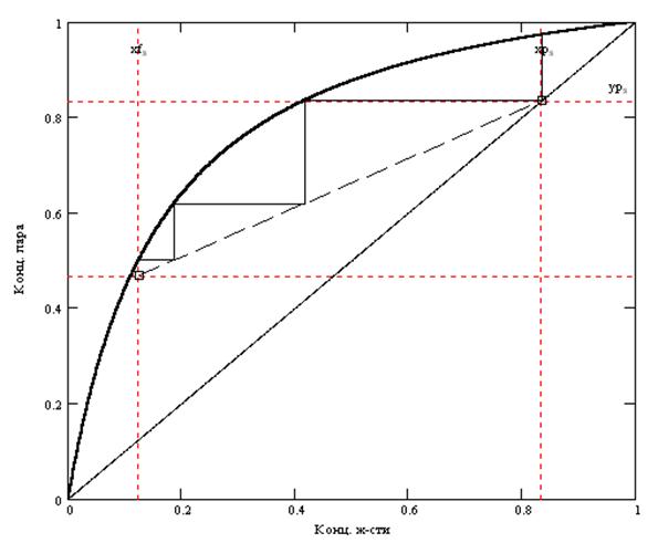 Рис.3 Теоретические ступениЧисло теоретических тарелок NТТ=6 Число теоретических тарелок в нижней части NН=4 Число теоретических тарелок в верхней части NВ=2 Расчёт физико-химических свойств смеси в верхней и нижней частях.Расчёт средних концентраций жидкости: