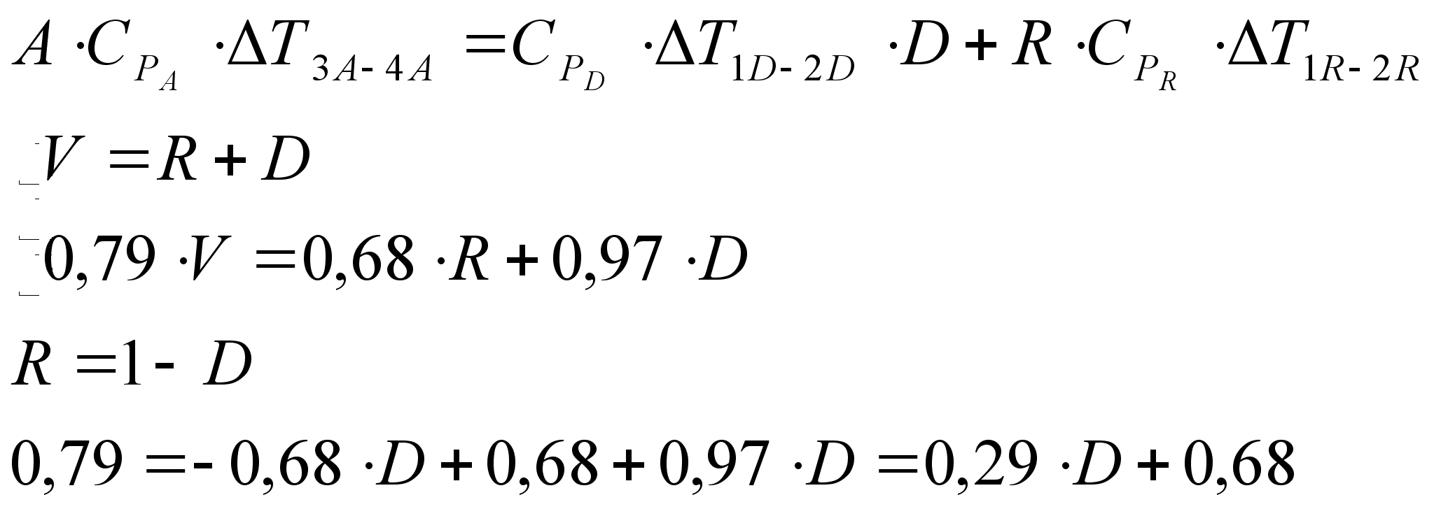 Σ(1/ΔТср) = 0,192 ΔТср = 10/0,245 = 52 К г) Материальный баланс теплообменника IV: (VК – Vдк)(i6В – i5B) + Vq3 = К(i4 – i2К) Из баланса расчитываем истинное значение теплопритоков из окружающей среды: (0,56 – 0,1)*2,204(188 - 138) + 1*q3 = 0,128*1,742(123 – 88) q3 = 7,804 - 50,7 = - 42,9 кДж/кг Рассчитываем коэффициенты В и D: (VК – Vдк)(i6В – i5B) + Vq3 = К(i4 – i2К) (Vк - Vдк) ΔiB + Vq3 = К Δiк ΔiB = К Δiк/ (VК - Vдк) - V q3/VК | ΔiК/ ΔiК ΔiB = К ΔiК/ (VК - Vдк) - Vq3* ΔiК/ ΔiК В =К/(VК - Vдк) = 0,128/0,46 = 0,278 D = V q3/(VК - Vдк) Δiк = -1*42,9/0,46*(372,6 – 332) = - 1,297 ΔiB = В ΔiК - D ΔiК = С Δiк = (0,278 + 1,297) ΔiК = 1,488 ΔiК Составляем таблицу:
