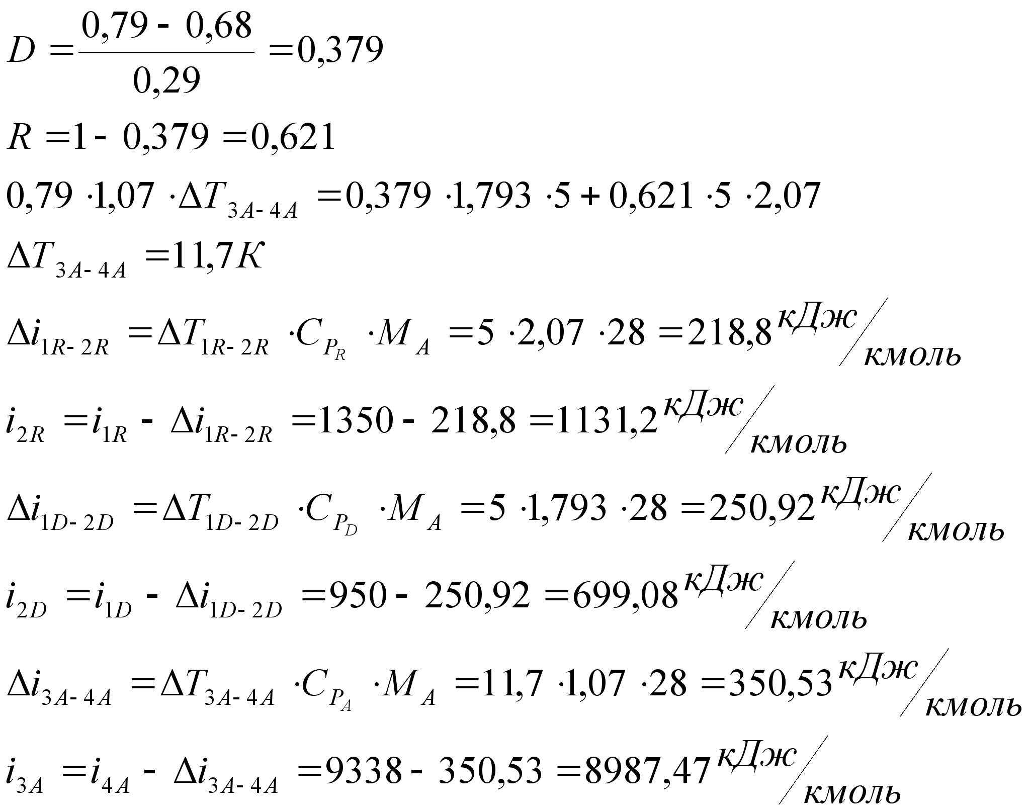 Σ(1/ΔТср) = 0,245 ΔТср = 10/0,245 = 40,3 К в) Материальный баланс теплообменника III: (VA – Vда)(i6В – i5B) + Vq3 = A(i3 – i2A) Из баланса расчитываем истинное значение теплопритоков из окружающей среды: (0,54 – 0,1)*2,204(188 - 138) + 1*q3 = 0,813*1,684(123 – 85) q3 = 55,8 – 33,9 = 21,9 кДж/кг Рассчитываем коэффициенты В и D: (VA – Vда)(i6В – i5B) + Vq3 = A(i3 – i2A) (VА - Vда) ΔiB + Vq3 = А ΔiА ΔiB = А ΔiА/ (VА - Vда) - V q3/VА | ΔiА/ ΔiА ΔiB = А ΔiА/ (VА - Vда) - Vq3* ΔiА/ ΔiА В =А/(VА - Vда) = 0,813/0,44 = 1,982 D = V q3/(VА - Vда) ΔiА = 1*21,9/0,44*(372,6 – 333,5) = 0,057 ΔiB = В ΔiА - D ΔiА = С ΔiА = (1,982 – 0,057) ΔiА = 1,925 ΔiА Составляем таблицу: