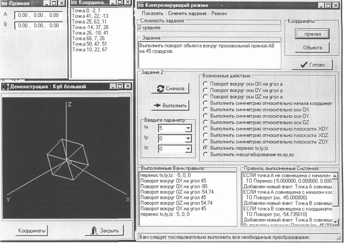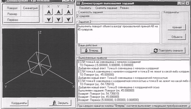 геометрических элементом системы координат система выполняет преобразование, описанное в задании относительно соответствующего элемента системы координат. 4) В последовательность геометрических преобразований добавляются действия для возврата примитива в исходное положение. На базе разработанного механизма вывода построен блок обеспечения работы обучающего и контролирующего режимов раздела "Продукционные системы". При работе пользователя в этих режимах наряду с выводом на экран последовательности геометрических преобразований, выводятся выполненные правила, которые наглядно показывают процесс формирования требуемой последовательности действий. Использование механизма вывода для продукционных систем состоит в том, что на его основе производится выборка и взаимная ориентация необходимых в каждый конкретный момент элементарных геометрических преобразований. Для обеспечения работы СДО в предусмотренных режимах был разработан блок выдачи заданий обучаемому. При этом задания, выдаваемые в разделе "Геометрические преобразования" не отличаются от заданий, выдаваемых в разделе "Продукционные системы". Задания обучаемому генерируются системой случайным образом, что в совокупности с перегенерацией способа задания опорных элементов практически исключает повторы системы при повторной работе в прежнем режиме одного и того же пользователя. Кроме того, в блоке выдачи задания все возможные варианты задач распределены по уровням сложности. Так как большинство режимов СДО строится на выполнении именно практических заданий, через данный блок стало возможным устанавливать уровни сложности для работы с конкретным обучаемым по его желанию. Задания распределены по уровням сложности исходя из сложности построения алгоритма получения требуемого преобразования (см приложение 6) При работе обучаемого в контролирующем режиме его задачей является выполнение выдаваемых системой заданий, т. е. формирование требуемой последовательности преобразований. Для обеспечения контроля действий обучаемого, корректировки его работы, привития практических навыков и проверки выполнения задания для самостоятельной работы был разработан контролирующий блок. В его задачу входит контроль правильности результирующего преобразования. Первоначальная версия реализации механизма вывода со всеми обеспечивающими функциями занимала порядка 3000 строк исходного текста, однако в последующих версиях ее размер сокращен до 1000 строк. С учетом подключения к механизму вывода других блоков (о чем говорилось выше) размер реализации составил 1400 строк исходного текста. Отметим, что размер только одной алгоритмической реализации блока получения любой последовательности преобразований с учетом многообразия входных данных составил бы около 7000 строк исходного текста без учета размеров всех остальных требуемых блоков. При этом реализация вспомогательных блоков (выдачи задания, контроля и т. д. ) на базе созданного блока получения отношений уже невозможна, что еще более увеличивает суммарный объем программы. Так как разработанная система является системой дистанционного образования, то связь обучаемого и преподавателя обеспечивается через линии коммуникации (например телефонная сеть). При этом размер передаваемых данных является довольно сущ