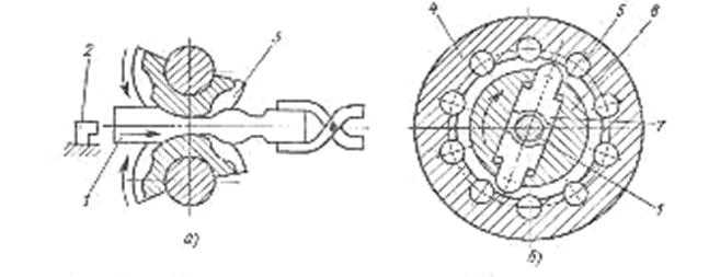 Нагретую заготовку 1 подают до упора 2 в тот момент, когда секторные штампы 3 расходятся. При повороте валков происходит захват заготовки и обжатие ее по форме полости; одновременно с обжатием заготовка выталкивается в сторону подачи. На вальцах изготовляют поковки сравнительно несложной конфигурации, типа звеньев цепей, рычагов, гаечных ключей и т. п. Кроме того, на вальцах фасонируют заготовки для последующей штамповки, чаще всего на кривошипных горячештамповочных прессах. Профилируют и штампуют на вальцах в одном или нескольких ручьях. Исходное сечение заготовки принимают равным максимальному сечению поковки, так как при вальцовке происходит главным образом протяжка. 4.3 Устройство и принцип работы деформирующего оборудования и штамповочной оснастки.
