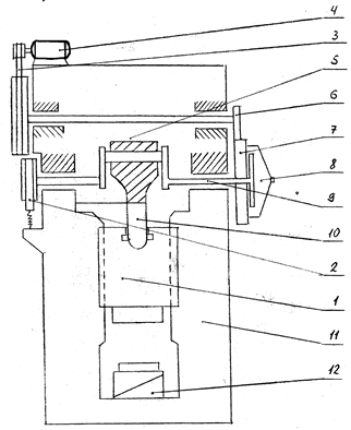 Кинематическая схема КГШП Рисунок 1 1- Ползун; 2- Тормоз 3- Шкив 4- Электродвигатель 5- Приёмный вал 6- Малое зубчатое колесо 7- Большое зубчатое колесо 8- Пневматическая функциональная дисковая муфта 9- Кривошипный вал 10- Шатун 11- Стол пресса 12- Клин Штамповка на кривошипных горячештамповочных прессах КГШП изготовляют усилием 5-10 мм. Они успешно заменяют и во многих случаях по технологическим возможностям превосходят паро-воздушные штамповочные молоты с массой подающих частей до 10 тонн. КГШП характерно то, что усилие, возникающее при штамповке, воспринимается массивной станиной. На станине пресса установлен электродвигатель. На его валу закреплён шкив, от которого крутящий момент через клиноременную передачу передаётся маховику, закреплённому на приёмном валу. На другом конце этого вала насажана малое зубчатое колесо, находящееся в зацеплении с большим зубчатым колесом со встроенной в него пневматической муфтой включения. Большое зубчатое колесо с муфтой расположено на коленчатом валу, который при вращении приводит в движение шатун с ползуном в направляющие стороны. Для остановки вращения кривошипного вала после включения муфты служит тормоз. Стол пресса, установленный на наклонной поверхности, может перемещаться клином и тем самым в незначительных пределах регулировать высоту штамповочного пространства. Для обеспечения удаления поковки из штампа пресса имеется выключатели в столе и ползуне. Выталкиватели срабатывают при ходе ползуна вверх. Остановка моховика производится тормозом при включенном электродвигателе. В отличии от молотов прессы имеют жёсткий график движения ползуна, полный ход которого вверх и вниз одинаков и равен удвоенному радиусу кривошипа. В связи с этим при многоручьевой штамповке невозможно применить протяжной, подкатной, отрубной ручьи. Поковки, требующие использования указанных ручьёв штампуют на КГШП из заготовок периодического проката или предварительно фасонированных на ковочных пальцах. Скорость ползуна в момент соприкосновения верхней части штампа с заготовкой равна 0,3 – 0,8 м/с, то есть в несколько раз меньше скорости базы молота в момент удара. Так как деформация выполняется в каждом ручье за один ход пресса, заготовки должны быть чистыми от окалины во избежании порчи поверхности паковки. Постоянство величины хода ползуна, большая точность его движения в мощных регулируемых направляющих станины пресса, применение штампов с направляющими колонками и выталкивателями для принудительного удаления поковок обеспечивает большую точность изготовления поковок, с меньшими штамповочными уклонами, припусками, допусками и расходом металла, чем при штамповке на молотах. Выталкиватели размещают в вертикальных отверстиях ручьевых вставок штампа. Во время штамповки рабочей поверхности выталкивателей составляют часть поверхности ручьёв. При обратном ходе ползуна специальный механизм в штампе, приводимый в действие от выталкивателя пресса, поднимает ручьевые выталкиватели, которые выбрасывают поковку из ручья. Для исключения заклинивания и поломки пресса открытые штампы на КГШП не смыкаются на величину заусенца из-за отсутствия ударов служат больше молотовых. На КГШП используют штампы сборной конструкции с ручьевыми вставками, которые при износе заменяют. Наличие выталкивателей обес
