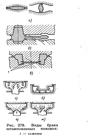 На штампованных поковках от окалины могут быть вмятины глубиной до 3 мм и забоины от механических повреждений при удалении из штампа и транспортировке горячих поковок. В результате удара по поковке, не находящейся в нижней фигуре штампа или смещенной относительно этой фигуры, последняя сплющивается (неисправимый брак — лом-бой). При недостаточных нагреве, числе ударов или массе падающих частей молота чистовой ручей, углы и ребра поковки не заполняются или недоштамповываются, что увеличивает размеры поковки по высоте._ В результате неисправности направляющих в машине и штампе одна половина поковки смещается относительно другой по плоскости разъема. Зажимы на заготовке образуются при сильных ударах по ней при протяжке или подкатке (рис. 278, а), при несоответствии чернового ручья чистовому (рис. 278, б), а также при эксцентричной укладке заготовок в штамповочные ручьи. На поковках может остаться заусенец, а также могут быть получены поковки повышенной кривизны и размерами с отклонениями от допусков. При штамповке па КГШП может не заполниться фигура штампа, покоробиться поковка при ее выталкивании, увеличиться размер поковки из-за повышенного износа штампа в месте наиболее интенсивного течения металла и образоваться зажим от истечения металла из перемычки или пленки в тело поковки (рис. 278,в). Из-за неправильной конструкции штампа при штамповке выдавливанием может возникнуть утяжка (рис. 278, г), зажим (рис. 278, (3), наружные и внутренние сколы ;(рис. 278, с, ж). Штампованные поковки контролируют на всех этапах их изготовления. Химический состав металла проверяют лабораторным химическим анализом, спектральным анализом с помощью стилоскопов, стиломеров или спектроскопов, сравнительным анализом по искре, возникающей при соприкосновении металла с переносным абразивным кругом, и термоэлектрическим анализом. Размеры профиля проверяют мерительным инструментом, а поверхностные дефекты обнаруживают визуально. Контролируют также время нагрева заготовок, а при индукционном нагреве и потребляемую индуктором мощность. Температуру заготовок контролируют оптическими пирометрами и термопарами, размеры штампованных поковок — универсальными и специальными измерительными инструментами. Из универсальных инструментов применяют штангенциркули, штангенвысотомеры, штангенглубиномеры, индикаторные кронциркули, радиусомеры, щуцы и др. Для всесторонних измерений первые и последние поковки, снимаемые со штампа, размечают на контрольной плите с применением поверочных призм, струбцинок и штангенрейсмуса. Для повышения эффективности контроля используют специальный инструмент — скобы, шаблоны, контрольные приспособления. Контрольные приспособления состоят из базирующего, зажимного и измерительного устройств. Их подразделяют на наладочные, показывающие фактические размеры поковок, и приемные, фиксирующие соответствие или несоответствие размеров поковки допуску. Контрольными приспособлениями можно сделать 300—1500 измерений в час. После термообработки контролируют твердость поковок но Бринелю. Затем из партии штампованных поковок отбирают 2—5 шт. для металлографического анализа и механических испытаний. Внешние дефекты на поковках выявляют в основном визуальным осмотром, на ответственных поковках — магнитным и люминесцентным методам