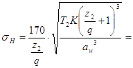 Для венца червячного колеса примем бронзу Бр010Ф1, отлитую в кокиль; для червяка – углеродистую сталь с твердостью HRC>45. В этом случае основное контактное напряжение [σH]’= 221 МПа. Расчетное допускаемое напряжение [σН]= [σН]’KFL тогда [σН]= 221*0,67=148 МПа.Число витков червяка Z1 принимаем в зависимости от передаточного числа: при u= 25 принимаем Z1=2 Число зубьев червячного колесаZ2=Z1*u=2*25=50Принимаем предварительно коэффициент диаметра червяка q=12,5 и коэффициент нагрузки К=1,2 Определяем межосевое расстояние из условия контактной прочности