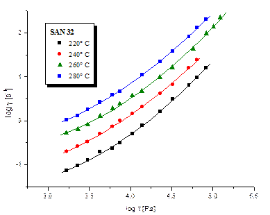 ЭКСПЕРИМЕНТАЛЬНЫЕ ДАННЫЕ И КОММЕНТАРИИ К НИМ. Эксперименты с образцами сополимеров стирола и акрилонитрила проводились при четырёх температурах и при значениях логарифма напряжений сдвига lgτ от 3 до 5.5 [Па]. На рис.5 представлены результаты экспериментов для типичного представителя образцов линейных САН (SAN 32) - качественно кривые выглядят одинаково.
