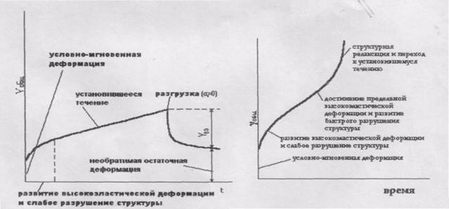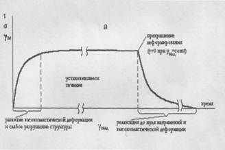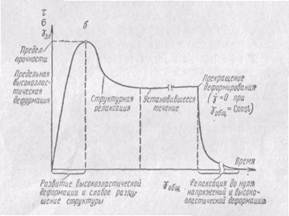 а б Рис.1. Изменение деформации во времени при различных напряжениях сдвига: а-низкое постоянное напряжение сдвига; б-высокое постоянное напряжение сдвига. При относительно низких напряжениях сначала развиваются высокоэластические деформации, однако постепенно доминирующее значение приобретает течение без внешних признаков разрушения структуры. При более высоких напряжениях наблюдается S-образная зависимость деформации от времени. После достижения предельной высокоэластической деформации начинается интенсивное разрушение структуры, приводящее к увеличению скорости деформирования. Таким образом, кривые зависимости деформации сдвига γ от времени при достаточно высоких напряжениях сдвига имеют три участка. Протяжённость второго участка зависит от действующего напряжения. При высоких его значениях этот участок вырождается в точку. Постоянная скорость сдвига. Развитие напряжений и деформаций при постоянной скорости сдвига схематически показано на рис. 2. Общая деформация γобщ складывается из высокоэластической γвэ и остаточной необратимой деформации γост. Зависимости σт(γобщ), σ(γобщ) и γвэ(γобщ) имеют качественно сходный характер. Однако это не значит, что простым изменением масштабов величин σт, σ и γвэ зависимости σт(γобщ), σ(γобщ) и γвэ(γобщ), получаемые при одинаковой скорости сдвига, могут быть совмещены. Особенно существенно различие между рассматриваемыми зависимостями при высоких скоростях сдвига. Во-первых, у систем, проявляющих резко выраженную высокую эластичность, максимум нормальных напряжений может иметь значительно более высокое значение, чем максимум касательных напряжений.