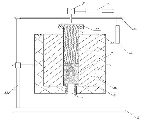 Рис. 6. Принципиальная схема микровискозиметра МВ-3М 1-капилляр; 2-груз; 3-исследуемый образец; 4-рычаг; 5-шток; 6-камера (бомба); 7-датчик перемещения; 8-индикатор перемещения; 9-печь с электрообогревом; 10-теплоизулирующая шляпка; 11-съёмная крышка; 12-штатив; 13-опорная плита. ИСХОДНЫЕ ДАННЫЕ.