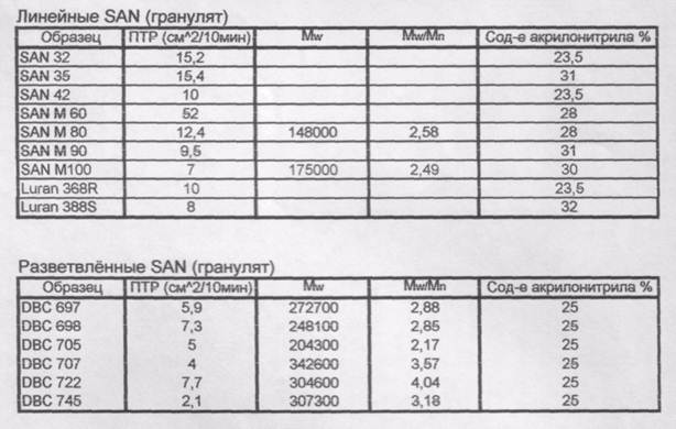 Рис. 156. Разбухание экстру дата для образцов САН при 220°С. Как явственно видно из данного графика - более всего разбухают разветвлённые образцы САН (что говорит о том, что они испытывают сильные высокоэластические деформации, нежели линейные образцы). Также можно заметить, что более сильно разбухающий DBC 745 имеет более высокую молекулярную массу и более широкое ММР, чем DBC 697 (табл. 1), и этот факт сам по себе служит объяснением этого феномена. 2.АБС Табл 2.1