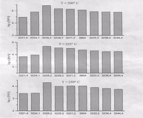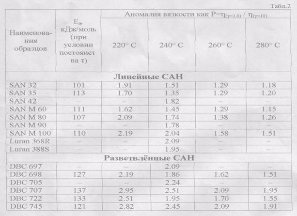 Как видно из таблицы 2 - увеличение отношения вязкостей при различных скоростях отражает увеличение аномалии вязкости. Оно показывает, что все линейные САН имеют немного близкие значения, которые отличаются не более, чем на 35-40% (т.е. они являются величинами одного порядка. В то же время рост температуры от 220 до 280°С приводит к уменьшению отношения вязкостей Р на 50-60% (можно предположить, что при увеличении температуры Р стремится к какому-то постоянному значению). Эксперименты при четырёх температурах (220,240,260,280) обнаружили линейную зависимость вязкости (в логарифмических координатах) от обратной температуры.