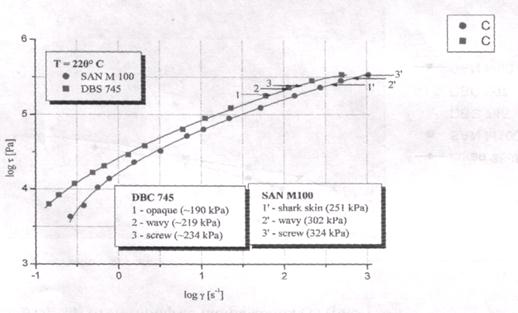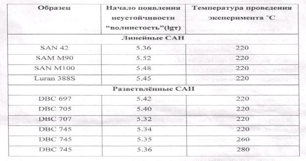 Из данных таблицы 3 видно, что при увеличении температуры, момент проявления критических явлений течения зависит от температуры (при увеличении температуры течения расплава полимера (а именно DBC 745) момент начала неустойчивости происходит немного позже, т.е. при более высоких напряжениях). Также при сравнении разветвлённых образцов видно, что раньше всего деффекты поверхности экструдата появляются у образца DBC 707, далее DBC 745 и DBC 705, и, наконец у DBC 697. Станет понятно почему результаты имеют именно такие значения, если взглянуть на таблицу 1 - пальма первенства по величине молекулярной массы исамому широкому молскулярно-массовому распределению принадлежит именно образцу DBC 707. И далее в том же порядке увеличиваются молекулярные массы и ММР образцов, что и увеличение напряжения, при котором начинает выходить из микровискозиметра экструдат волнистой формы (ММР DBC 697 -существенно шире, чем у DBC705 - поэтому у пего раньше наступает начало неустойчивости). В общем случае можно отметить, что наступление этих явлений у разветвлённых образцов происходит раньше нежели у образцов линейных. Неудивительно - так как сегменты разветвлённых молекул менее подвижны, поэтому при больших напряжениях они испытывают в капилляре только высокоэластические деформации и на выходе из него не успевают отрелаксировать. Для наглядности можно привести график с кривыми течения для разветвлённого и линейного образца САН с отметками о наступлении различных форм проявления неустойчивости (рис. 15а).