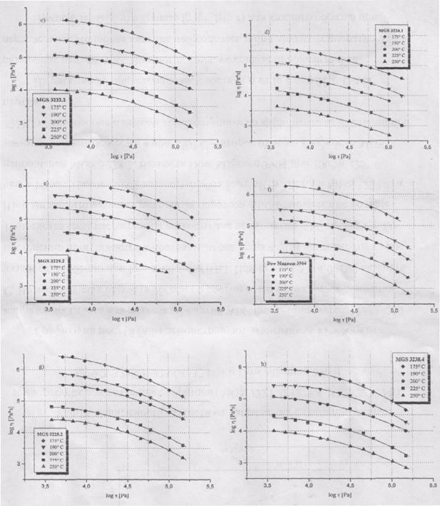 Рис. 18. Зависимость вязкости от напряжения сдвига при разных температурах для различных образцов (MGS 3221.2, 3221.4, 3222.2, 3224.1, 3229.2, 3228.2, 3238.4, 3244.4 и Dow Magnum 3904). Графики на рис. 18 (а-и) демонстрируют зависимость вязкости от напряжения сдвига для различных партий АБС при температурах 175° - 250° С. Во всех случаях вязкость убывает с ростом т, т.е. проявляется аномалия вязкости, особенно при lg τ ≥ 4,0 - 4,5 [Па]. При lg τ < 3,5 - 4,0 [Па] вязкость постепенно приближается к постоянным значениям. Для наглядности на рис. 19 представлены гистограммы вязкости для всех партий АБС при lgτ=4,0 [Па]. Видно, что вязкость различных образцов АБС отличается не больше чем в 10 раз. Наименьшей вязкостью обладают MGS 3221.4 и MGS 3224.1, а наибольшей MGS 3228.2. Вязкость Dow Magnum 3904 при 200° и 225° С занимает четвертое место, а при 250° С - второе (близко к вязкости MGS 3221.2). Это говорит о низком температурном коэффициенте вязкости данной партии. На рисунке 20 приведена зависимость lgη от lgτ при 200° С для различных партий АБС. Во многих случаях кривые приблизительно параллельны. Подобная картина наблюдалась и при других температурах. Примечательно, что кривые lgη = f(lg τ) для каждого образца при разных температурах также параллельны (рис. 18).Это означает, что они должны совмещаться при сдвиге вдоль оси вязкости. В качестве температуры приведения нами была выбрана 200° С. Фактор сдвига lgат=lg(η/η200) должен отражать температурную зависимость вязкости образца.