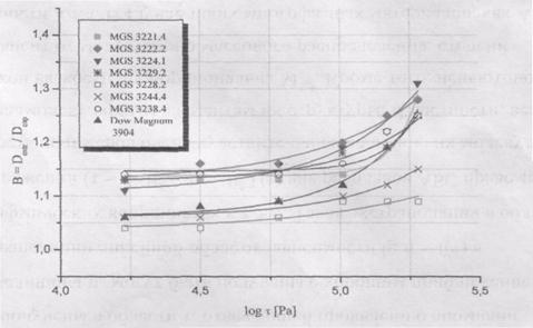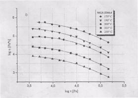 На рисунке 17 приведены кривые течения MGS 3221.2 и Dow Magnum 3904 при 200° С. Подобные кривые были получены для всех остальных образцов. Они типичны для неньютоновских полимеров, вязкость которых уменьшается при увеличении скорости (γ) или напряжения (τ) сдвига. При напряжениях сдвига ниже lgτ = 4,1 [Па] экструдаты имеют неровную поверхность, при больших τ этот эффект исчезает.