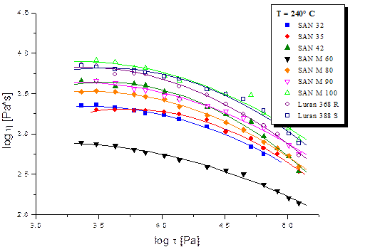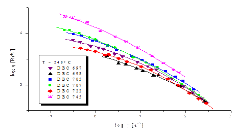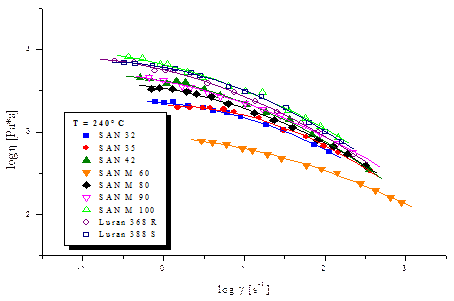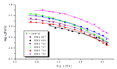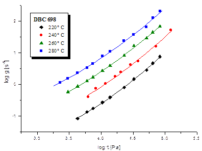 Рис. 8. Экспериментальные данные типичного представителя разветвлённых САН (DBC 698) Общий вид кривых для разветвлённых образцов, в принципе, носит аналогичный характер как и у кривых для линейных САН. Можно отметить, что при тех же значениях напряжений, у разветвлённых образцов скорости деформаций имеют более низкие значения, нежели у линейных. Это опять же можно объяснить с точки зрения конформации полимеров, проще говоря, разветвлённые образцы имеют меньшее число степеней свободы движения сегментов их макромолекул, отсюда и вытекает, что нужно приложить большее напряжение, чтобы полимер стал испытывать необратимые деформации (течь). Теперь перейдём непосредственно к кривым течения (lgη=f(lgγ)) и рассчитанным значениям вязкостей (для определённости вычисленным по приведённым выше формулам для lgγ=1.0 [с-1]). Итак, на рис.9 приведена сравнительная диаграмма вязкостей линейных образцов САН при 240°С, а на рис.10 зависимость lgη от lgγ также при 240°С.