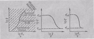 Рис. 2. Зависимость касательного, нормального напряжения и высокоэластической деформации от общей деформации при различных скоростях сдвига: а-низкая постоянная скорость сдвига; б-высокая постоянная скорость сдвига. Во-вторых, положения максимумов зависимостей σт(γобщ), σ(γобщ) и γвэ(γобщ) отвечают всё более возрастающим значениям γобщ, т.е. максимальное нормальное напряжение достигается при более высоких значениях общей деформации, чем максимальная высокоэластическая деформация, а эта последняя при большей γобщ, чем предел сдвиговой прочности. Следовательно, предел прочности характеризует условия разрушения наиболее прочных (медленно релаксирующих) связей между элементами структуры, сдерживающих развитие высокоэластических деформаций. Высокоэластические деформации могут развиваться только до определённого предела. У полимерных систем в текучем состоянии они могут достигать тысяч процентов. Достигнув наибольшего значения, высокоэластические деформации начинают уменьшаться, что в свою очередь указывает на ослабление пространственной структурной сетки в результате её разрушения. Нормальные напряжения продолжают расти даже при некотором снижении способности полимерной системы проявлять высокоэластические деформации. Повышение температуры, во всяком случае для расплавов и концентрированных растворов полимеров, подавляет проявление высокой эластичности. Становится затруднительным или невозможным обнаружить у них критические (предельные) значения σт, σ и γвэ. При этом сильно ускоряется достижение установившихся режимов течения, протекание всех релаксационных процессов и ослабляется аномалия вязкости. ВЯЗКОСТЬ. Связь между скоростью и напряжением сдвига определяется законом Ньютона. Пользуясь введёнными выше обозначениями, его можно записать так: σт=ηγ' (la) lgσт=lgη+lgγ' (16) где η - коэффициент пропорциональности, называемый вязкостью. Её размерность г*сек-1*см-1; эта единица называется пуазом (пз). Вязкость характеризует сопротивления полимера сдвигу, или его внутреннее трение. В зависимости от природы веществ и их температуры вязкость в текучем состоянии (газы и пары здесь не рассматриваются) может имеет значение примерно от 10-2 до 1013 пз. Вязкость полимеров изменяется от тысяч (для относительно низкомолекулярных) до 1013 пз соответствует переход жидкости в твёрдое стеклообразное состояние. При постоянных значениях температуры и давления значения вязкости, т.е. отношение напряжения к скорости сдвига, может не зависеть от режима деформирования. Среды, удовлетворяющие этому условию, называются ньютоновскими. К ним относятся множество низкомолекулярных жидкостей, При обычных скоростях сдвига течение в них не вызывает изменения структуры. Непрерывная перестройка её под действием теплового движения происходит настолько быстро, что внешнее воздействие на этот процесс при ограниченных значениях скорости сдвига оказывается несущественным. В то же время возможны случаи, когда влияние теплового движения на изменение структуры -взаимного положения молекул в веществе (у полимеров также их конформации) -проявляется слабее, чем действие сдвига, или соизмеримо с его действием. В зависимости от соотношения скорости сдвига и скорости протекания релаксационных процессов, обусловленных тепловым движением, вязкость,