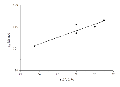 Рис.12 Зависимость энергии активации от содержания акрилонитрильных групп в образцах САН. Расчёты показали, что энергия активации течения, вычисленная при использовании уравнения Аррениуса, находится в пределах 110-115 кДж/моль в случае ньютоновского течения. Значения Еа взяты из вязкостно-температурных зависимостей, при условии постоянства напряжения сдвига. В случае деформации при любой скорости сдвига, её (γ) увеличение приводит к уменьшению энергии активации. Величина Еа увеличивается с увеличением концентрации акрилонитрила в образцах линейных САН (см. рис. 12). Различные значения энергии активации для образцов с содержанием акрилонитрильных групп 28% (SAN M80 и SAN M60) очевидно обусловлено различиями их молекулярных масс и молекулярно-массовых распределений (см. табл.1). На основании исходных данных о молекулярной массе и ММР этих двух образцов более высокие значения вязкости SAN M100 обусловлены также и его более высокой молекулярной массой (почти на 20% выше чем у SAN M80) и более узким ММР. Так как для течения всей макромолекулы необходимо совместное перемещение многих сегментов, то становится понятно, что сопротивление, оказываемое макромолекулой в потоке, зависит от её молекулярной массы, что и наблюдается в случае этих двух образцов (рис. 10) - вязкость наиболее "тяжёлого" выше. Также на это оказывает влияние и количество зацеплений в макромолекулах. Теперь перейдём к рассмотрению образцов разветвлённых САН. Данные, полученные при эксперименте, представлены на рис.8 в логарифмических координатах - зависимость скорости сдвига от напряжения сдвига. Также представлены кривые течения для них при 240°С на рис.13. И сравнительная диаграмма их вязкостей при скорости сдвига γ=1,0 (рис.14).