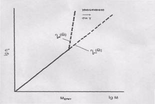 Рис. 4. Зависимость вязкости от молекулярного веса полимера. Чем выше молекулярный вес полимера, тем сильнее в нём развито надмолекулярное структурообразование и тем при более низких скоростях и напряжениях сдвига совершается переход к неньютоновскому течению. Это справедливо только в пределах одного полимергомологического ряда. Следовательно, появление аномалии вязкости, также как и изменение характера зависимости наибольшей ньютоновской вязкости от молекулярного веса, служит признаком образования в полимерах надмолекулярных структур и для гибких линейных полимеров позволяет оценить средние размеры участков цепей между зацеплениями. Аномалия вязкости зависит от ММР полимеров. ЭФФЕКТИВНАЯ ВЯЗКОСТЬ. Аномалия вязкости обусловлена изменением структуры полимерных систем под влиянием деформирования. Это обнаруживается при повышении напряжений и скоростей сдвига и проявляется при молекулярных весах М>Мкр, что соответствует интенсивному развитию структурообразования. На неньютоновских режимах течения зависимость вязкости от молекулярного веса ослабевает. Для очень высоких скоростей и напряжений сдвига, когда достигается ньютоновская вязкость и структура полимера становится предельно изменённой, зависимость вязкости от молекулярного веса оказывается линейной (рис. 5).