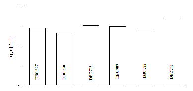 Рис.14. Диаграмма вязкостей разветвлённых САН при у=1.0 и 240°С. Вообще, как видно из рис.10 и рис.13 течение линейных и разветвлённых образцов схоже качественно, однако существенно различается количественно. Так, даже при значениях lgτ=3.5-3.7 разветвлённые САН демонстрируют всё ещё неньютоновский характер течения (см. рис.15). Из этого же рисунка видно, что наибольшей вязкостью обладают образцы ВВС 745 и DBC 707 - это обусловлено их высокими молекулярными массами и широкими ММР, по сравнению с другими образцами (см табл.1). А наименьшая вязкость DBC 698 объясняется исходя из тех же соображений (низкая М и ММР). Но вот "аномально" большая вязкость DBC 705 (при низкой М и ММР) можно объяснить исходя из предположения, что макромолекулы этого образца имеют больше ответвлений на единицу длины, и тогда становится очевидным, что подвижность такой макромолекулы в целом будет ниже и, следовательно, вязкость этого полимера будет выше.