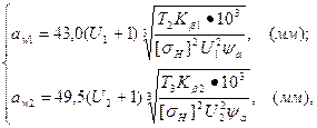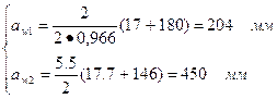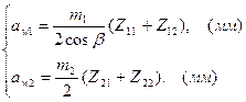 = Для прийнятих кінематичних схем редуктора (рис. 1) міжосьову відстань першого ступеня аw1 та другого ступеня аw2 визначають за формулами: