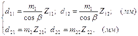 m1 = 2 m2 = 5,5 1.9 Визначення числа зубців зубчастих пар та остаточних значень міжосьової відстані. Число зубців косозубої шестерні (перший ступень) знаходять за формулою: Z11 = Z11 = де b - кут нахилу зубців,