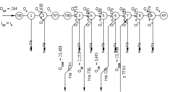 GПГ = 264 кг/с. GП1 = 10,974 кг/с; GП2 = 3,215 кг/с; GП3 = 5,289 кг/с; GП4 = 7,476 кг/с; GП5 = 4,106 кг/с; GП6 = 6,845 кг/с; GП7 = 17,718 кг/с; GП8 = 24,63 кг/с; GП9 = 14,316 кг/с.