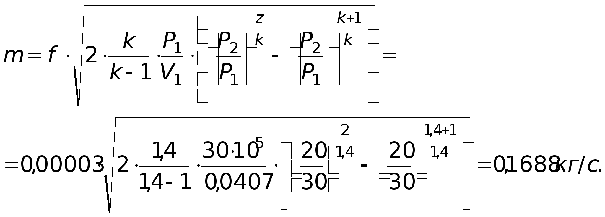 Задача № 6. Із ємності при температурі Т = 470 К і тиску р1 = 30 бар витікає 1 кг кисню через сопло, яке звужується, в середовище із тиском р2 = 20 бар. Визначити швидкість витікання і масову витрату кисню (кг/с), якщо площа вихідного сопла f = 30 мм. Розв’язок: Співвідношення тисків: