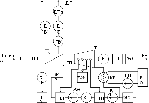 Р П – повітря; ЕЕ – електроенергія; ПГ – паливне господарство; ПП – підготовка палива; ДВ – дуттьовий вентилятор; ПГ – парогенератор; ДГ – димові гази; ПУ – пилоуловлювачі; ДС – димосос; ДТр – димова труба; БГ – багерні насоси; ПВ – пилошлаковідвал; ГП – гострий пар; Т – турбіна; ГТ – головний трансформатор; ЕГ – електрогенератор; КР – конденсатор; ВО – водоохолоджувач; ЦН – циркуляційний насос; КН – конденсатний насос; ТФУ – теплофікаційна установка; ХВО – хімводоочистка; ПНТ – підігрівач низького тиску; Д – деаератор; ПВТ – підігрівач високого тиску; ЖН – живильний насос; ВРП – відкритий розподільчий пристрій; ЖВ – живильна вода. К ПИТАННЯ НА ІСПИТ