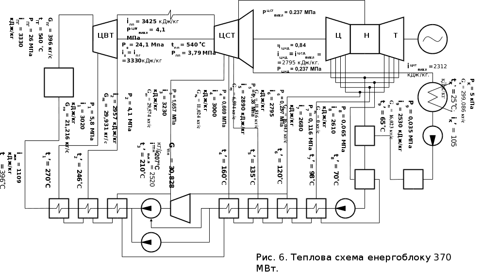 Дата захисту: до 6 грудня 1998 року. Завдання видав: ________ Головченко О.М. Завдання прийняв: _________ Іванько М.М. Дата: 24 вересня 1998 року. Початкові дані: цвт = 0.81; цст = 0.9; цнт = 0.84; жн = 0.75; мех = 0.98; муфти = 0.98; тжн = 0.8; г = 0.99; сн = 0.96; пг = 0.91; тр = 0.98. t3 = t4 = t5 = t6 = 3°C; t7 =t8 = t9 =1°C. 0 = 1 = 2 = 3 = 0,05. 4 = 5 = 6 = 7 = 8= 9 = 0,08. P0 = 0.95Pпг = 0.95·29 = 27,55 МПа; P1 = 0.235P0 = 0.235·27,55 = 6,47 МПа;