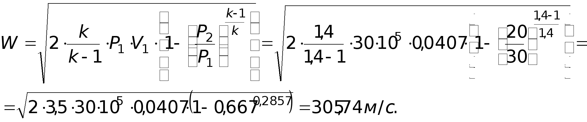 Задача № 7. Із ємності при температурі Т = 470 К і тиску р1 = 30 бар витікає 1 кг кисню через сопло, яке звужується, в середовище із тиском р2 = 20 бар. Визначити швидкість витікання і масову витрату кисню (кг/с), якщо площа вихідного сопла f = 30 мм. Розв’язок: Співвідношення тисків: