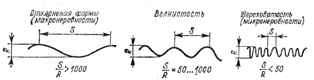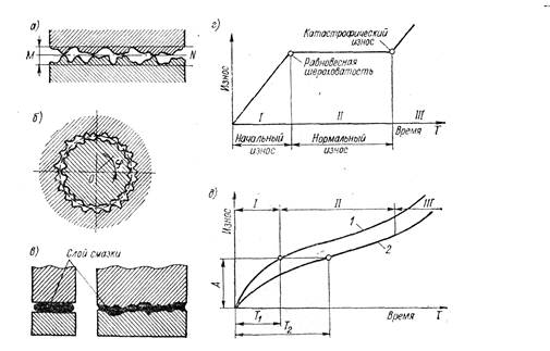 Рис 2. Шероховатость поверхности и её влияние на износостойкость. а, б — схемы контакта сопряженных деталей по образующей (вдоль оси) и по окружности; в — идеализированный и фактический контакт поверхностей; г, д — типовые графики износа во времени. Шероховатость и волнистость поверхности взаимосвязаны между собой. Волнистость является элементарным отклонением поверхности любой формы. Высота неровностей волнистости и высота шероховатости примерно одинаковы, отношение же шагов к высоте различны. Волнистость — совокупность периодически повторяющихся неровностей на поверхности, которые образуются прежде всего в связи с колебаниями или относительными колебательными движениями в системе станок—инструмент—изделие. Волнистость определяется на нормальном сечении поверхности, причем шероховатость и другие отклонения формы исключаются. К волнистости, как правило. относятся периодические неровности, у которых отношение шага к высоте больше 40. У изделий с круглым сечением к волнистости относятся отклонения в радиальном сечении, у которых шаг меньше 1/15 окружности.