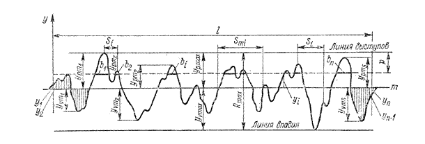 Рис. 3Профиль шероховатости, его характеристики и параметрыВ дополнение к количественным параметрам в некоторых случаях целесообразно нормировать направление неровностей, например в связи с направлением относительного перемещения трущихся сопряженных поверхностей или струи жидкости, или газа относительно поверхности, а также для обеспечения необходимой виброустойчивости и прочности при циклических нагрузках. При необходимости конструктором устанавливается также способ или последовательность способов получения (обработки) поверхности, если они являются единственными для обеспечения ее заданного качества. При назначении параметров шероховатости поверхностей следует проверить возможность их достижения в связи с рациональными методами обработки детали. Как правило, следует применять наибольшую шероховатость, допускаемую конструктивными требованиями. В противном случае может значительно увеличиться стоимость обработки, что может быть компенсировано лишь повышением качества изделия. В некоторых же случаях повышение требований к шероховатости может оказаться не только не рентабельным, но и недопустимым. Например, при слишком гладких сопрягаемых поверхностях может возникнуть явление «схватывания», При котором частицы металла отрываются от поверхностного слоя трущихся поверхностей. Для таких поверхностей следует нормировать оптимальную исходную шероховатость, которая должна быть близкой к получающейся в процессе приработки Обычно отделать отверстие труднее, чем вал. Это часто учитывается назначением различной шероховатости поверхностей сопрягаемых деталей : у отверстия шероховатость несколько выше. Правильное решение, принятое при выборе параметров шероховатости поверхностей деталей, а также при выборе методов обработки, обеспечивающих получение ; поверхностей с заданной шероховатостью, оказывает серьезное влияние на качество : конструкции, ее технологичность и позволяет установить наиболее экономичные методы изготовления деталей . Для обеспечения условий взаимозаменяемости назначение шероховатости сопряженных поверхностей может производиться в зависимости от точности сопряжения (выбранной посадки) и точности обработки (выбранного квалитета). Прямой связи между точностью и шероховатостью поверхности нет, так как к самым неточным поверхностям по допуску размера можно предъявить весьма высокие требования шероховатости (например, поверхности ручек хирургического инструмента в т. п.). Вместе с тем при выборе шероховатости поверхности следует учитывать что значение Rz должнo составлять лишь некоторую часть допуска (δp) соответствующего размера. Если в конструкциях сопряжении, согласно требованиям к эксплуатационным качествам деталей, необходимо ограничить отклонение формы (Δф) или отклонение расположения (Δп) по сравнению с допуском на размер (δр), то соответственно должна быть ограничена и шероховатость поверхности. При этом следует ориентироваться ва возможные (рекомендуемые) методы обработки, обеспечивающие получение значений Rz =(0,2-0,5) Δф или Rz =(0,24-0,5) Δц . Если, точность сопряжения и метод обработки не позволяют определить требования к шероховатости поверхностей, назначение шероховатости поверхности следует производить по другим главным для данного случая признакам, ориентируясь 