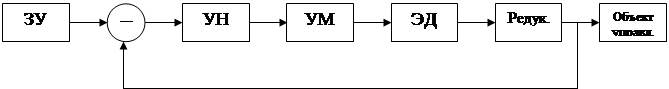 Рассматриваемая следящая система относится к числу дистанционных систем, в которых сравнение сигналов управления и обработки производится путем суммирования электрических величин. Это повышает удобство пользования системой автоматического регулирования, так как задающее устройство можно расположить в удобном для пользователя месте, а также повышает надежность системы потому, что электронную часть САУ можно расположить вдали от ОУ, который обычно находится в жестких условиях. Система работает следующим образом. Входная и выходная величины САУ сравниваются в измерителе рассогласования. Сигнал ошибки усиливается по напряжению в УН и по мощности в УМ, а затем подается на управляющую обмотку электродвигателя, который вращаясь стремиться уменьшить сигнал рассогласования. Для получения требуемой скорости вращения в схему включен редуктор.