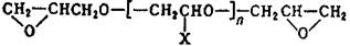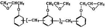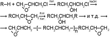 (Кат.- катализатор, в качестве которого используют основания, кислоты, соли металлов: n=0-3). Если реакцию проводят в присутствии кислот, то на концах молекул остаются хлоргидриновые группы; поэтому для осуществления дегидрохлорирования добавляют щёлочь. Молекулярная масса эпоксидиановых смол определяется соотношением исходных
