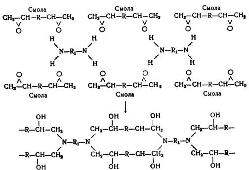 А затем карбоксильная группа раскрывает эпоксидное кольцо другой молекулы смолы: