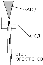Рис. 21. Принципиальная схема электронной пушки После взаимодействия потока электронов с образцом возникаю вторичные (ВЭ) и упруго отражённые электроны (ОЭ), Оже-электроны, рентгеновское излучение. Для РЭМ представляют интерес ВЭ и ОЭ, они регистрируются коллектором электронов (рис. 22). От того же генератора развертки луча (или генератора сканирования, смотри рис.23) работает катодно-лучевая (телевизионная) трубка, яркость электронного луча этой трубки модулируется сигналом от коллектора электронов, подаваемого через усилитель видеосигнала[8].