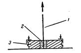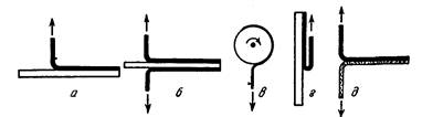 Рис. 2. Схемы испытаний по отслаиванию гибких материалов от жесткой подложки под углом 90° (а, б, в) и 180° (г) и по расслаиванию гибких материалов (д). Разделение двух гибких материалов называют расслаиванием, а отделение гибкого материала от жесткого — отслаиванием. Если пленка адгезива (покрытия) недостаточно прочна, то при отделении от субстрата она может разрушиться. Чтобы этого не произошло, пленка укрепляется подходящим армирующим материалом. Пользоваться армирующим материалом приходится и в тех случаях, когда адгезив или субстрат под действием расслаивающего усилия способен сильно деформироваться — растягиваться. В тех случаях, когда разделяются путем постепенного нарушения связи два монолитных, негибких материала, такое испытание называют раскалыванием или отдиром. Все эти виды испытаний могут быть объединены одним общим термином — неравномерный отрыв. Многие из методов стандартизированы. Различные схемы испытаний на неравномерный отрыв приведены на рис.1 и 2[6]. Методы равномерного отрываМетодом равномерного отрыва измеряют величину усилия, необходимого для отделения адгезива от субстрата одновременно по всей площади контакта. Усилие при этом прикладывается перпендикулярно плоскости клеевого шва, а величина адгезии характеризуется силой, отнесенной к единице площади контакта (в Г/см2 или кГ/см2). Некоторые из этих методов стандартизованы.