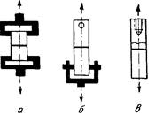 Рис. 4. Схемы измерений адгезии полимеров к металлам: а—цилиндрические образцы—грибки; б—цилиндрические или призматические образцы с осевым креплением; 3—то же, с резьбовым креплением. Адгезию резины к ткани также иногда определяют этим методом. Образцы приготавливают следующим образом. Ткань приклеивают к торцовым поверхностям деревянных цилиндров, выступающие края ткани загибают и крепят проволокой в выточке на цилиндре. Сырую резину накладывают на ткань и проводят вулканизацию. Подобным методом иногда измеряют адгезию заливочных компаундов к металлам, полимеров к стеклу, определяют прочность связи между слоями в стеклопластиках и т. д. На рис. 5. показаны некоторые схемы испытаний по этим методам. Иногда вместо склеенных встык цилиндров для измерения адгезии методом отрыва применяют образцы в виде крестовины (рис. 6). Таким методом измеряют адгезию клеев к металлам, дереву и стеклу[6]. В образцах типа грибков и крестовин под действием нагрузки возникают сложные и неоднородные напряжения. Адгезив растягивается сильнее, чем субстрат, и в большей степени подвергается поперечному сжатию. Вследствие этого возникают сдвиговые напряжения. Результирующие напряжения в слое адгезива оказываются неодинаковыми в различных местах площади контакта. Кроме того, растягивающее усилие не всегда прикладывается точно по оси образца. Все это вызывает наряду с отрывом появление расслаивания. Ускоренная киносъемка показала отсутствие параллельности поверхностей склейки непосредственно в момент отрыва.