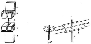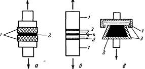 Рис. 5. Схемы измерений адгезии полимеров к различным материалам методом отрыва: а—резина к ткани (I — ткань, укрепленная на деревянном грибке; 2— резина); б — смола к стеклу (1-металлические цилиндры; 2 - стеклянные пластинки; 3 — клей; 4 — слой смолы); в — заливочные компаунды к металлам (1— металлическая подложка; 2—компаунд; 3— держатели). Более равномерного распределения напряжений можно добиться увеличением длины цилиндрического образца и уменьшением площади склеивания, что снижает влияние расслаивания при отрыве. В образцах типа крестовин особенно велика неоднородность напряжений. Так как нагрузка прикладывается к концам брусков, они стремятся изогнуться, поэтому приходится пользоваться массивными образцами. При переходе к более толстым блокам сопротивление отрыву возрастает, что объясняется снижением гибкости блоков и соответственно более равномерным распределением напряжений[6].