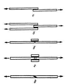 Метод скрещенных нитей, в котором две кварцевые нити, покрытые пленками полимеров, приводятся в контакт, а затем отрываются друг от друга, позволяет измерить работу отрыва, по которой судят об адгезии. Этот метод оказался весьма эффективным для изучения кинетики прилипания тел в самых различных условиях. Метод скрещенных нитей основан на том предположении, что имеет место точечный контакт (поскольку применяются нити диаметром 20—100 мк) и нарушение контакта происходит мгновенно по всей площади путем равномерного отрыва. В действительности получить точечный контакт не удается, а определить истинную площадь контакта не представляется возможным. Это является одной из причин плохой воспроизводимости результатов. В тех случаях, когда адгезив и субстрат после приведения их в контакт подвергают полимеризации, вулканизации или какому-либо другому необратимому химическому превращению, этот метод вообще неприменим. Интересный метод определения адгезии покрытий к подложкам основан на- отделении подложки от покрытия путем отрыва. Впервые он был разработан для определения сцепляемости электролитических осадков металлов с основой, а затем использован для определения адгезии полимерных покрытий к металлам. Сущность метода сводится к следующему. В планке-подложке прямоугольного сечения просверливаются отверстия, в которые вставляют цилиндрические или конические штифты по скользящей посадке. Торцы штифтов шлифуются вместе с планкой, затем на эту плоскость наносится покрытие. После формирования покрытия штифты выдергиваются (рис. 7). Однако метод штифтов может оказаться непригодным при использовании покрытий в виде растворов с низким поверхностным натяжением: трудно будет избежать затекания раствора в зазор между штифтом и стенкой отверстия. Кроме того, пленка покрытия должна обладать определенной механической прочностью, чтобы не произошло вместо отслаивания штифта разрушения пленки. Имеется несколько методов отрыва адгезива от субстрата (или наоборот) путем сообщения адгезиву или субстрату ускорения[6]. Методы сдвигаКасательные напряжения создают в клеевых конструкциях различными путями, например растяжением соединенных внахлестку материалов. Этим методом измеряют адгезию металлов, древесины, пластмасс, а также резины к резине и металлам. Различные схемы испытаний на сдвиг при растяжении образцов показаны на рис. 8. Установлено, что разрушающее напряжение не зависит от ширины образца, но линейно зависит от его длины до некоторого предела. При дальнейшем увеличении длины образца разрушающая нагрузка стремится к постоянной величине. Причина этого заключается в концентрации напряжений у концов образца, вызванной разностью деформаций склепных элементов и их изгибом. Испытание клеевых соединений на сдвиг (срез) под действием сжимающих нагрузок (рис. 9) наиболее характерно для соединения материалов значительной толщины. Иногда этим методом испытывают и образцы из тонких слоев металла, но в таких случаях к ним подклеивают для устойчивости толстые деревянные бобышки.