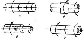 Испытание на сдвиг при кручении образцов имеет перед рассмотренными методами растяжения и сжатия одно важное преимущество: при кручении возникает чистый сдвиг без отрывающего усилия. В наиболее чистом виде сдвиг реализуется при скручивании двух тонкостенных цилиндров, склонных торцами. На рис. 10 приведены схемы испытаний клеевых соединений скручиванием. Описанный в предыдущем разделе метод штифтов также вполне пригоден для испытаний кручением. Получаемые при этом результаты не зависят от толщины покрытия. Известен также способ измерения адгезии покрытий путем скручивания приклеенных торцами к поверхности покрытия цилиндрических полых или сплошных стержней[6].
