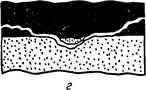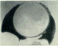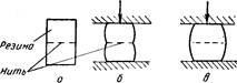 Сдвиговые усилия возникают на границе между адгезивом и субстратом и в случае деформации полимерного блока, внутри которого находится субстрат. На этом принципе основан метод измерения адгезии резины к текстилю. При испытании по методу отслоения при статическом сжатии нить корда располагают внутри образца по диаметру среднего сечения. Испытание заключается в определении усилия сжатия, при котором сдвиговые напряжения между резиной и кордом достигают величины, равной прочности связи между материалами. В тот момент, когда воронкообразное углубление, возникшее на поверхности образца при его сжатии, исчезает (рис. 14), измеряют нагрузку. Момент отслоения нити определяют визуально или с помощью тензодатчиков, контролируя величину внутренних напряжений[6]. При испытании по 1-методу (Аш- методу) кордная нить расположена внутри резинового образца по его длинной оси. Нагрузка при растяжении образца монотонно возрастает, а в момент начала отслоения нити наблюдается некоторое уменьшение напряжения. Отслоение второго конца нити приводит к повторному спаду напряжения, а сам образец при этом сильно вытягивается. Широкого распространения этот метод не получил. Аналогичен описанному метод измерения адгезии покрытий к металлам. При формировании пленки в нее вводят отрезки металлической проволоки. Растяжение пленки приводит к отслоению проволоки от полимера. Для определения адгезии связующего к стеклянным нитям иногда применяют цилиндрические образцы, изготовленные из ориентированных стеклянных нитей, пропитанных полиэфирной или эпоксидной смолой. Об адгезии судят по сопротивлению сжатию вдоль оси этих цилиндров.