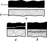 Рис. 1. Схемы испытаний по отслаиванию жестких материалов: а — внецентренное растяжение для блочных материалов; б — изгиб для плиточного и листового материалов; в — изгиб для листового материала; а—консольный изгиб.