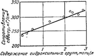 Рис. 16. Зависимость сопротивления сдвигу клеевых соединений алюминия от содержания гидроксильных групп в эпоксидной смоле (отвердитель – фталевый ангидрид). Эпоксидная, и гидроксильная группы, будучи весьма полярными и реакционноспособными, играют большую роль в адгезии эпоксидных смол к различным субстратам, в том числе к металлам. Роль какой из этих групп является главнее, однозначно ответить нельзя. Всё зависит от конкретных условий — вида и количества отвердителя, природы поверхности субстрата и других факторов. При адгезии полимера к металлу роль химической природы адгезива оказывается решающей. Важно чтобы адгезив не просто содержал в определенном количестве полярные группы, а чтобы эти группы обладали способностью вступать в интенсивное взаимодействие с поверхностными группами субстрата, например выполняли роль доноров электронов. Чем более четко выражены электронодонорные свойства функциональных групп, тем выше их адгезия к металлу. Между атомами металла и углеводородами в системе адгезив—субстрат возможны химические связи. Между углеводородом и металлом может возникнуть ковалентная связь[6]. Несмотря на возможность химического взаимодействия между металлом и углеводородами, значительно больший интерес для адгезионных систем представляет механизм взаимодействия полимерных адгезивов с окисной пленкой, образующейся практически на любой металлической поверхности. Благодаря этому во многих случаях на границе полимер—металл могут возникать ионные связи. Чаще всего этот тип связей реализуется при контакте металлов с карбоксилсодержащими и гидроксилсодержащими полимерами. Между поверхностью металла, покрытой гидратированной окисной пленкой, и функциональными группами полимеров могут возникать различные химические связи. Эпоксидные смолы с поверхностью металла реагируют по схеме: