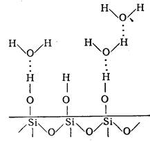 Известно что окисные пленки на таких металлах, как алюминий, цинк и олово весьма компактны, прочны, имеют небольшую толщину, отличаются хорошими защитными свойствами и хорошей сцепляемостью с металлом. Окисные пленки на меди, наоборот, отличаются большой толщиной, значительным количеством дефектов и слабой связью с металлом. Поэтому влияние окисных пленок на металлах приводит к разным результатам адгезии. В связи с эти применяют различные способы химической обработки поверхности металлов. Эксперименты по склеиванию металлов полимерными адгезивами, нанесению на металлы лакокрасочных, электроизоляционных и других покрытий свидетельствует о том, что долговечность связи полимер — металл зависит во многих случаях от таких свойств полимеров, как термостойкость, коэффициент теплового расширения, влагостойкость, озоностойкость, морозостойкость, прочность, модуль упругости и др. Чем меньше различие коэффициентов теплового расширения полимера и металла, тем устойчивее оказывается адгезионное соединение полимер — металл к воздействию высоких температур. Напряжения, возникающие в процессе формирования клеевых соединений и покрытий, также влияют на долговечность связи полимер—субстрат[6]. 4.2. Адгезия эпоксидных смол к стеклу В разделе будет рассмотрена адгезия эпоксидных смол к силикатному стеклу, основным компонентом которого является SiO2. Тетрайдеры кремнийкислородной сетки силикатного стекла содержат также окислы одно-, двух- и трёхвалентных металлов. С тетрайдерами кремнийкислородной сетки структурно связаны поверхностные гидроксильные группы. Кроме гидроксильных групп на поверхности стекла имеется слой сорбированной влаги, достигающий большой величины – порядка сотен ангстрем. Эта влага с трудом удаляется в вакууме при нагревании до 400-500 оС. Схематически поверхность стекла может быть изображена следующим образом: